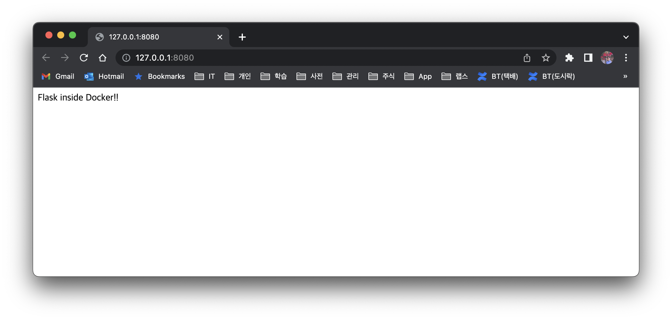 컨솔 창에서 출력하는 버전외에 웹 어플레이션도 도커나이즈해보자. 서버 구동후 8080 포트로 접속하면 "Flask inside Docker!!"를 출력하는 파이쎤 코드이다.