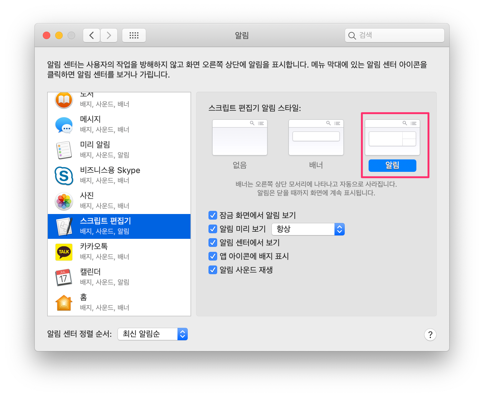 시스템환경 > 알림 > 스트립트 편집기 선택후 아래와 같이 알람 스타일을 변경한다.