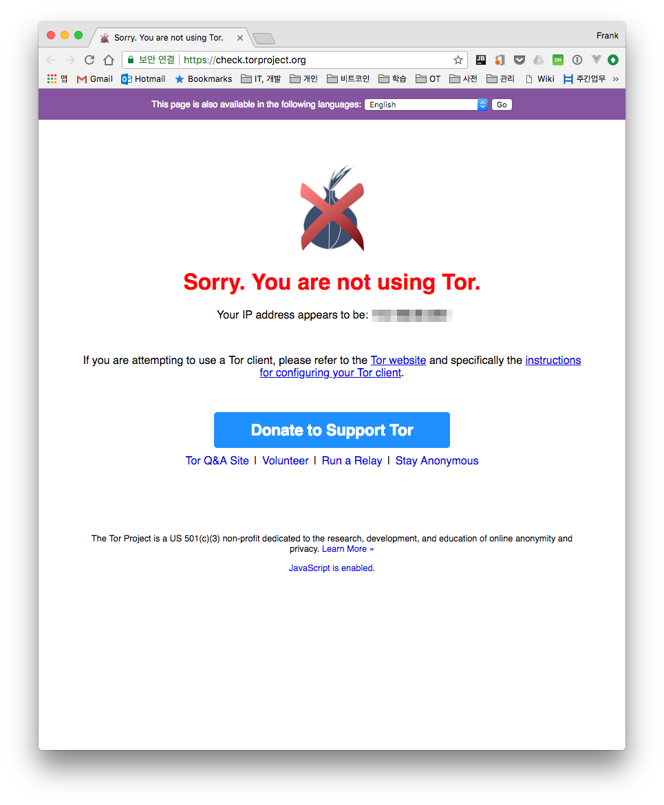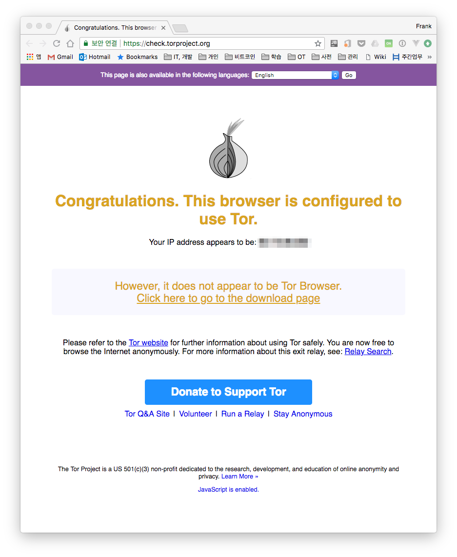 토르 세팅이 잘 되었는지 확인하려면 아래 사이트에 접속하여 확인할 수 있습니다.