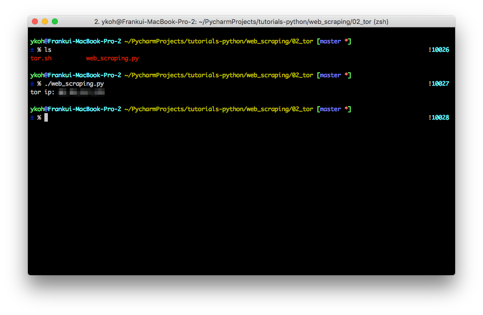 torsocks 명령어로 얻은 IP 주소와 위 파이썬 스크립트로 실행한 주소가 같음을 확인할 수 있습니다.