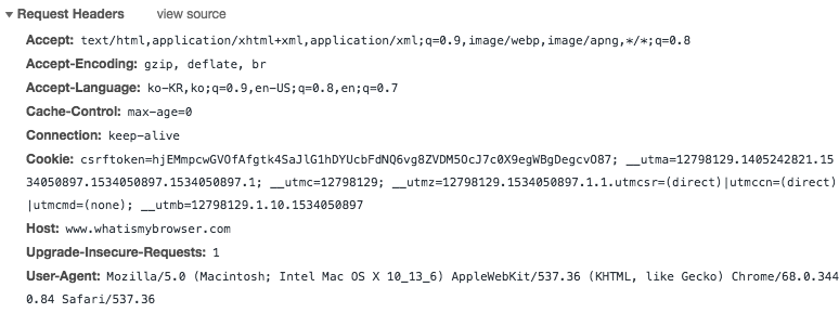 웹 사이트에 접속할때 서버로 보내는 HTTP 헤더를 확인해보면 다양한 정보를 담아서 보냅니다. 특히 User-Agent의 정보는 현재 사용하는 브라우져를 알수 있습니다.