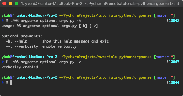 커맨트 라인에서 flag 형태의 옵션이 가장 많이 사용된다. Flag 옵션(-v, --verbosity)이 주어졌을 때 실행하는 옵션이다. add_argument() 함수를 통해서 여러 옵션에 대해서 설정할 수 있다. 아래와 같이 dash 입력으로 short와 long 옵션을 지정할 수 있고 해당 옵션에 대한 설명은 help= 키워드에 지정하면 된다. action 키워드에 ’store_true’로 지정 하면 해당 옵션이 명시될 때 True 값이 지정되고 없으면 False로 지정된다.