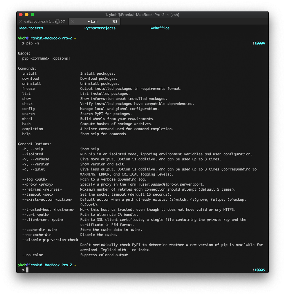 셀이나 리눅스 명령어를 실행할 때 많은 옵션이 존재한다. 아래는 pip 명령어(파이썬 패키지 관리자)의 옵션 목록이다. Flag 형태의 옵션(ex. --no-color)이나 입력값을 받을 수 있는 옵션(ex. --log )도 있다.