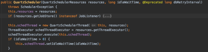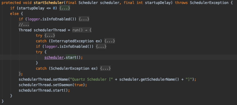 - StdScheduler.start() 메서드에서 실제 QuartzScheduler 관련 쓰레드를 시작해서 등록된 Job들을 실행한다