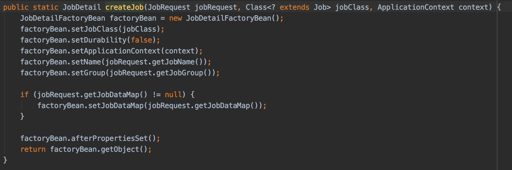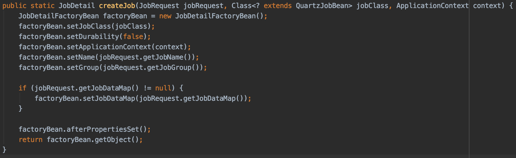 - Job을 실행시키기 위한 정보를 담고 있는 객체이다. Job의 이름, 그룹, JobDataMap 속성 등을 지정할 수 있다. Trigger가 Job을 수행할 때 이 정보를 기반으로 스케줄링을 한다