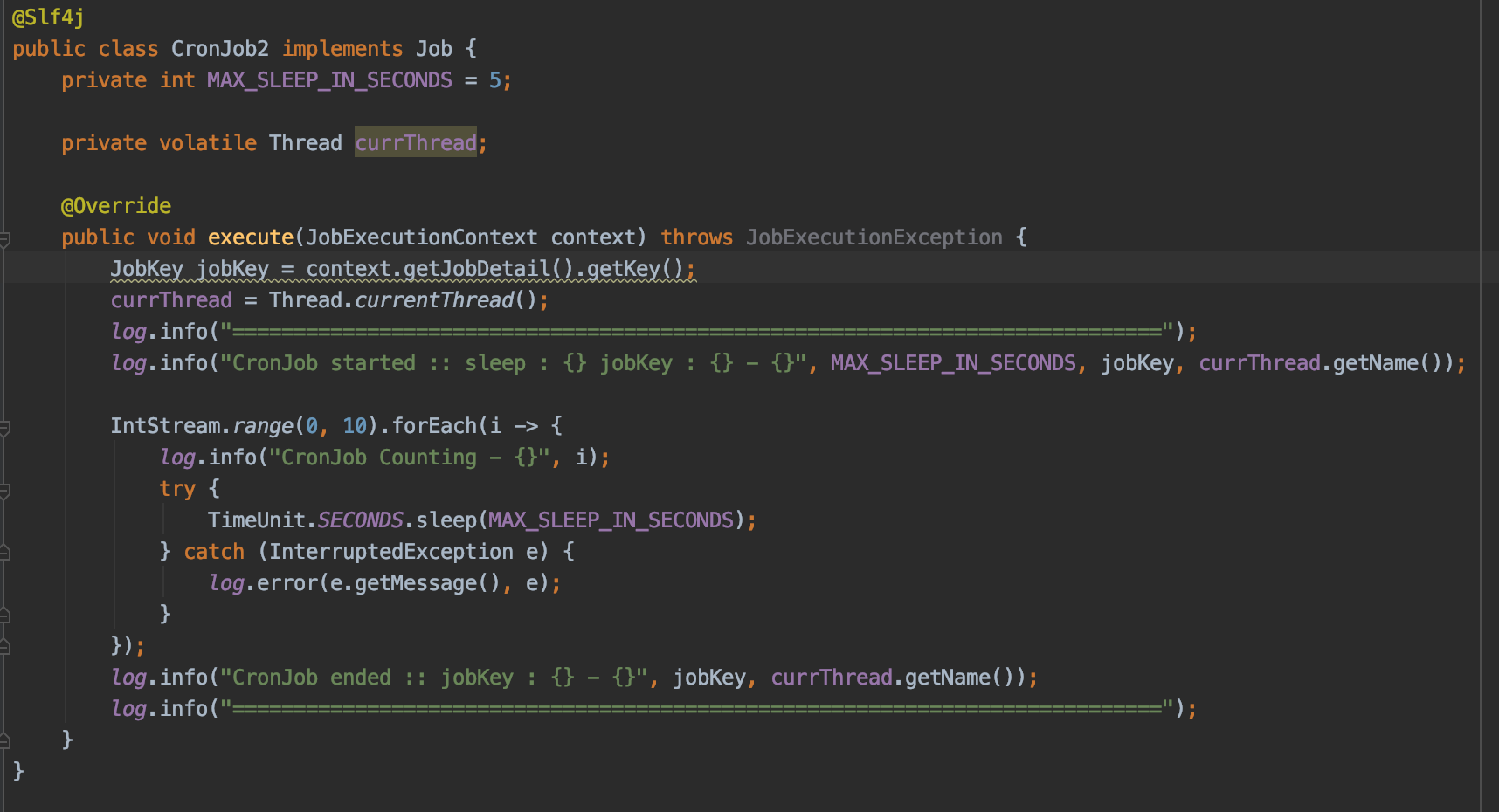 - Quartz API에서 단 하나의 메서드를 가진 execute(JobExecutionContext context) Job 인터페이스를 제공한다. Quartz를 사용하는 개발자는 수행해야 하는 실제 작업을 이 메서드에서 구현하면 된다.