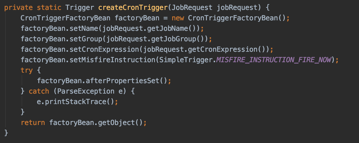 - CronTrigger는 cron 표현식으로 Trigger를 정의하는 방식이다 (ex.매일 12시 - '0 0 12 * * ?’)