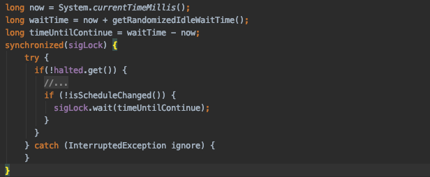 - 스케줄러가 halted된 상태가 아니면 계속 loop을 돌며 Job을 실행하는 메인 로직이 들어있다