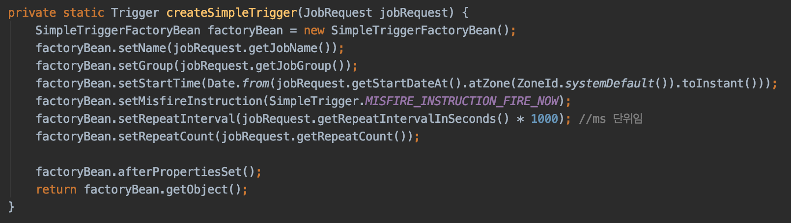 - Trigger는 Job을 실행시킬 스케줄링 조건 (ex. 반복 횟수, 시작시간) 등을 담고 있고 Scheduler는 이 정보를 기반으로 Job을 수행시킨다.