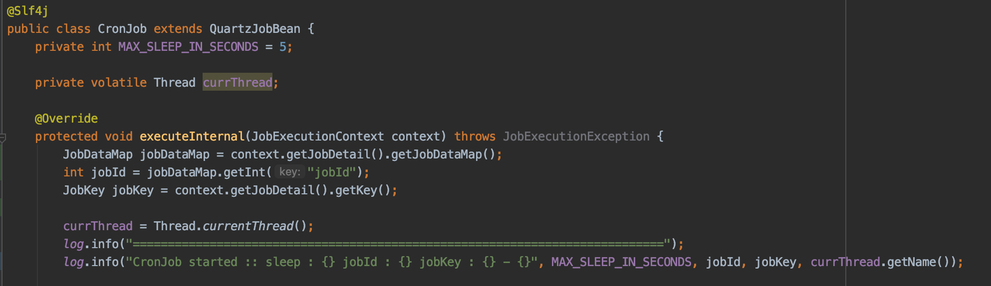 - Job 실행시 스케줄러에 Job 추가시 넣었던 JobDataMap 객체를 아래와 같이 접근하여 사용할 수 있다