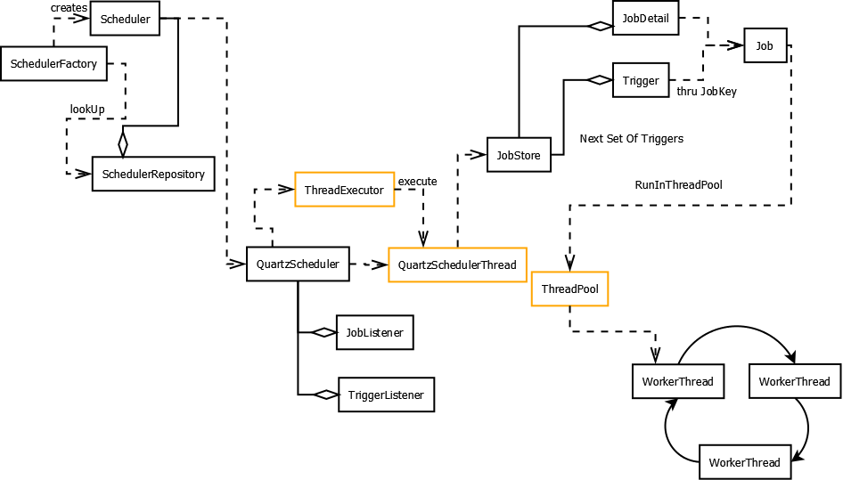 Java Articles 블로그에서 가져온 다이어그램입니다. Quartz의 전체 구조와 흐름을 잘 보여주는 그림입니다. Quartz의 세밀한 설정을 이해하는데 공식 문서도 도움이 되지만, 실제 소스코드 를 보면 Quartz의 동작과 전체 아키텍처 구조를 이해하는데 많은 도움이 됩니다.