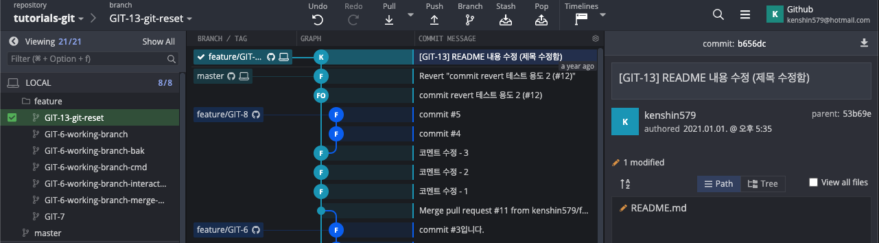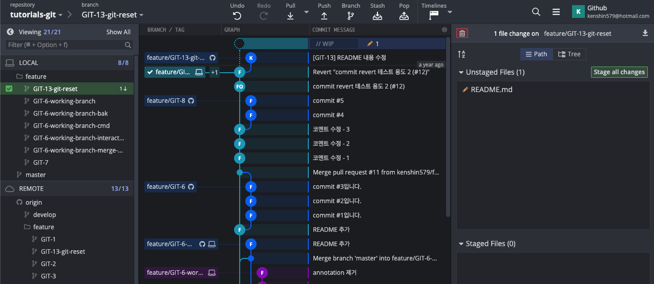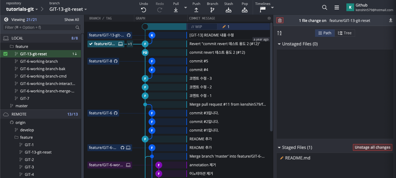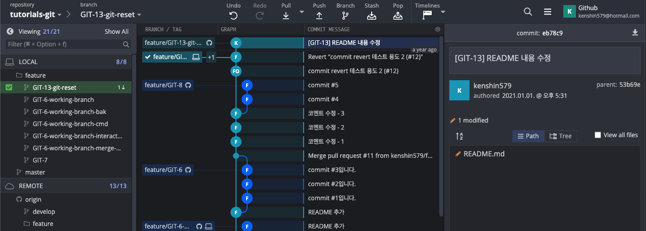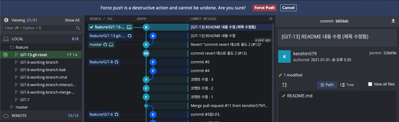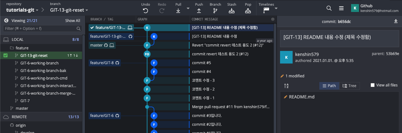 이제 GitKraken에서 어떻게 3가지 모드로 리셋을 할 수 있는 지 직접 해보자. 현재 GIT-13을 커밋하고 remote repository에 푸시를 한 상태이다. 이제 전 커밋으로 3가지 모드로 되돌려 보자.