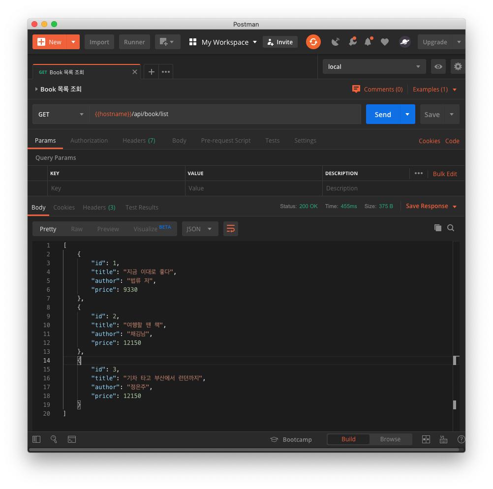 Postman을 사용해서 http://localhost:8080/api/book/list API를 호출하면 DB에 추가된 데이터를 응답 값으로 확인할 수 있습니다.