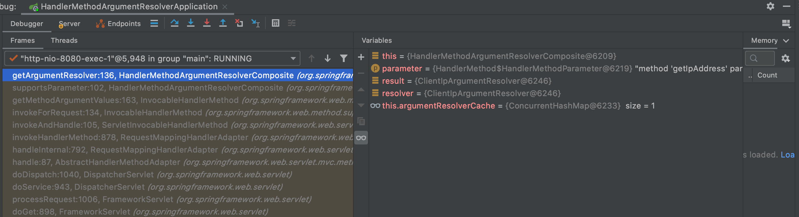 DispatcherServlet.doDispatch()-> ...생략... ->invokeHandlerMethod()-> ...생략... ->InvocableHandlerMethod.getMethodArgumentValues()->getArgumentResolver()순으로 실행되는 것을 확인할 수 있다.