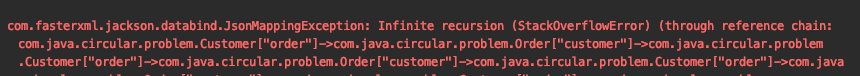 Customer와 Order 두 객체는 서로 순환 참조 (Circular Reference)를 하고 있습니다. Customer 객체가 Order 객체를 가지고 있고 Order 객체가 Customer 객체를 가지고 있는 경우입니다.