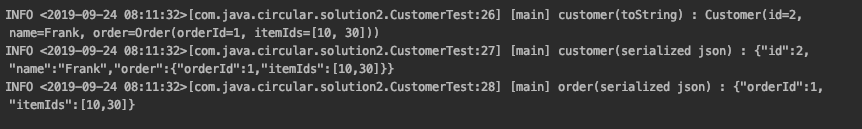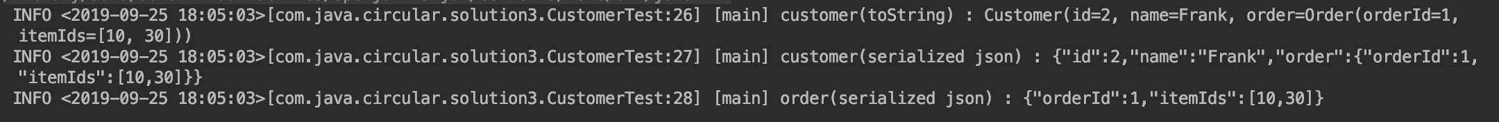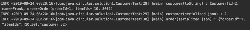 log.info("customer(serialized json) : {}", objectMapper.writeValueAsString(customer)); //id로만 출력된다
