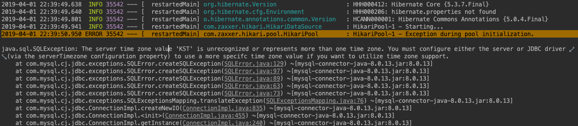 여러 사항에 따라서 해결 방법이 다를 것으로 판단됩니다. 저희 경우에는 pom.xml에서 mysql-connector-java의 버전(ex. 8.0.13 —> 5.1.47)을 변경해서 해결했습니다.